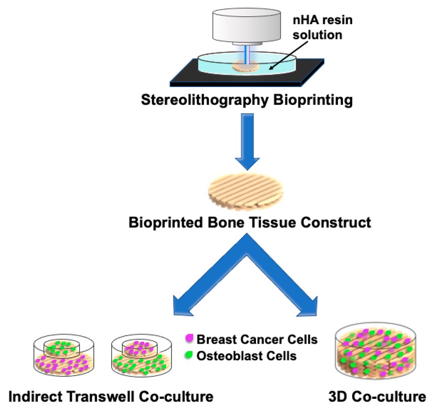 Figure 1. 3D bioprinted bone tissue constructs to study crosstalk between osteoblasts and breast cancer cells.